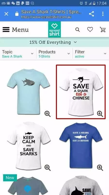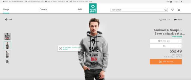 昨天下午,小编接到华人爆料,Spreadshirt网正在销售Save a Shark, Eat a Chinese”(想救鲨鱼,就得吃掉华人)的辱华文化衫。