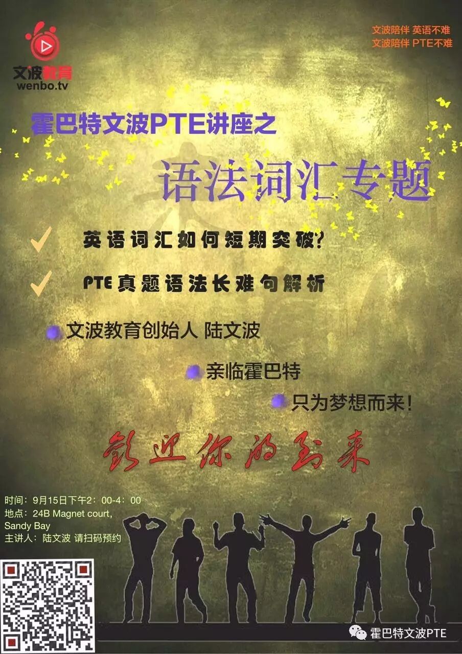 “文波英语创始人”——陆文波老师 为你带来最全面的解答! 考PTE不知道学什么单词、 背什么句法? 作文怎么写能拿高分, 阅读句子怎么分析才能理解? 陆老师来霍巴特为大家带来权威解读! 9月15日下午14:00-16:00 你想知道的一切,统统为你解答! 地址:24B Magnet Court, Sandy Bay 电话:041-511-7777 报名请直接电话或扫码联系微信“霍巴特文波英语”
