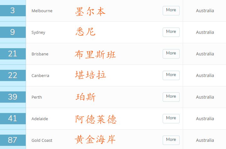 这是什么概念呢?要知道,澳大利亚全国上下只有8个首府城市,这次竟然有6个位居世界前50,这一比例堪称世界第一!
